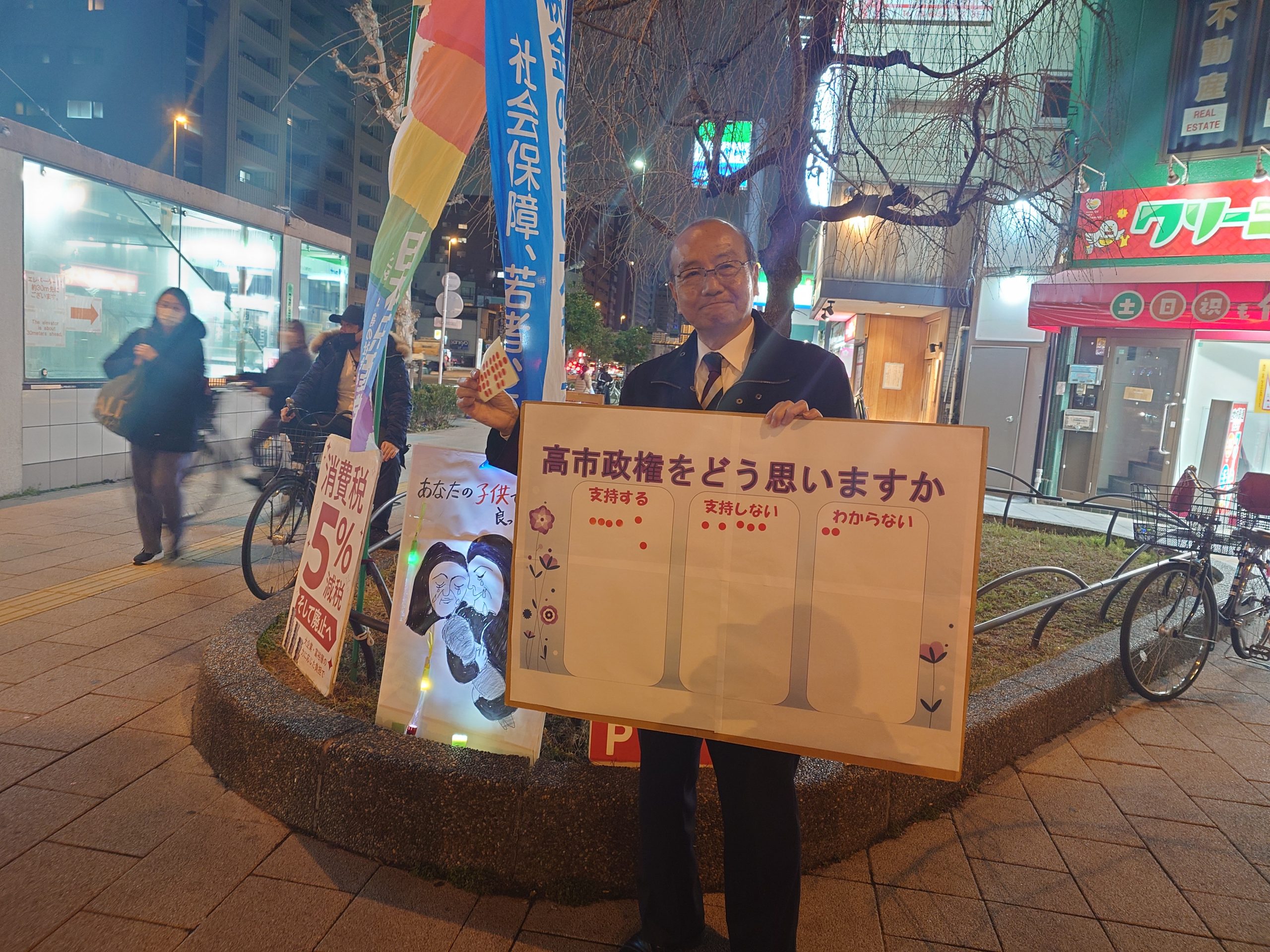 3月6日夕方、入谷駅頭でストリート対話。「高市政権をどう思いますか?」のシールボードを持って意見を聞きました。