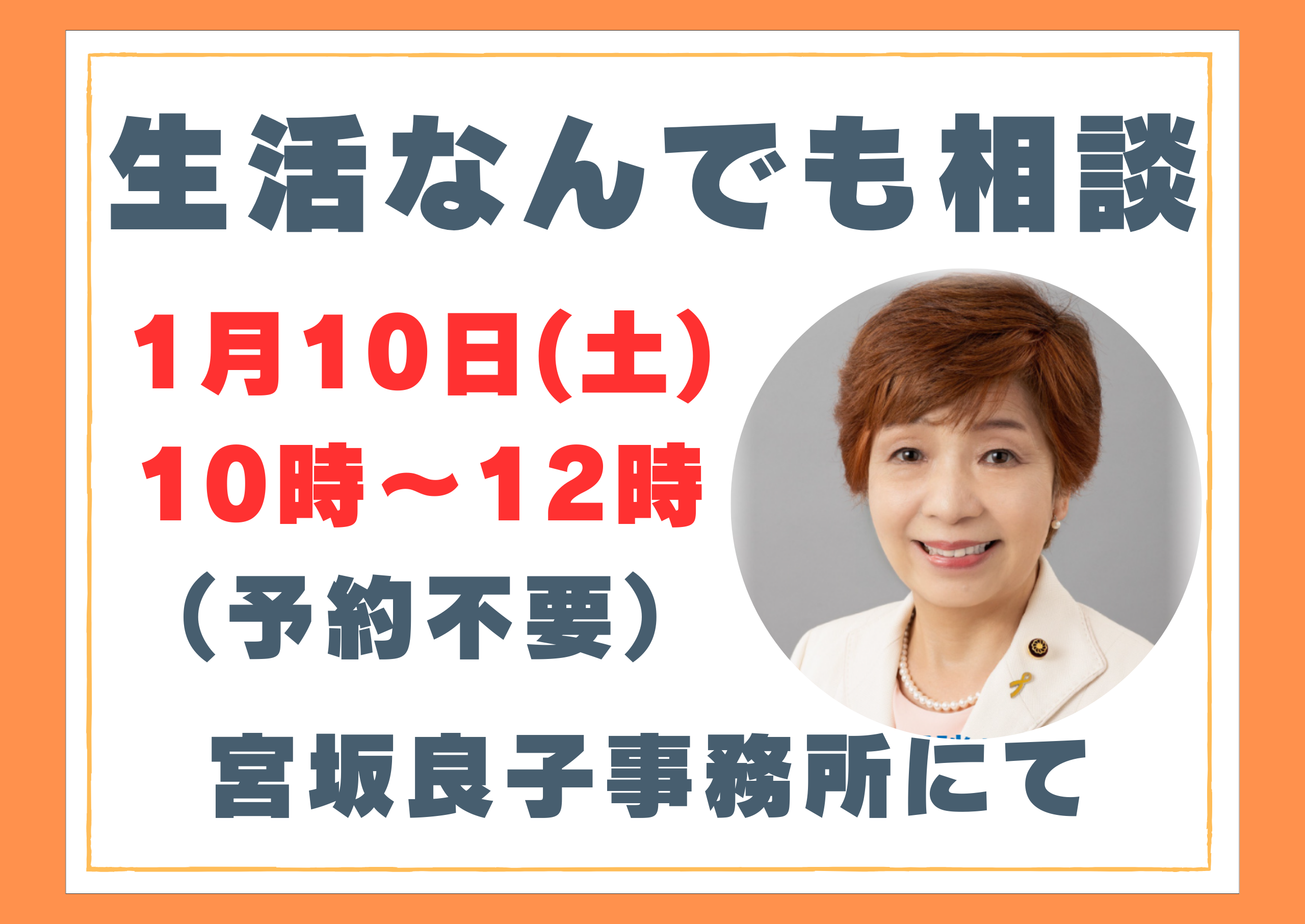 生活なんでも相談1月開催のご案内 2026/01/09 活動報告 こんばんは⛄ 明けましておめでとうございます。 本年もよろしくお願いいたします。 さて、今年最初の生活なんでも相談 開催日をご案内します㊗️ ⛄1/10(土) 午前 10 ~12 時⏰ 宮坂良子事務所にてお待ちしています☺️ この週末、狛江には雪予報は出ておりませんが、寒波到来とのことでぜひ暖かくしておいでください。 1人で悩まずどんなことでもお気軽にご相談ください☺️ なお、開催日以外も相談は受け付けています😊