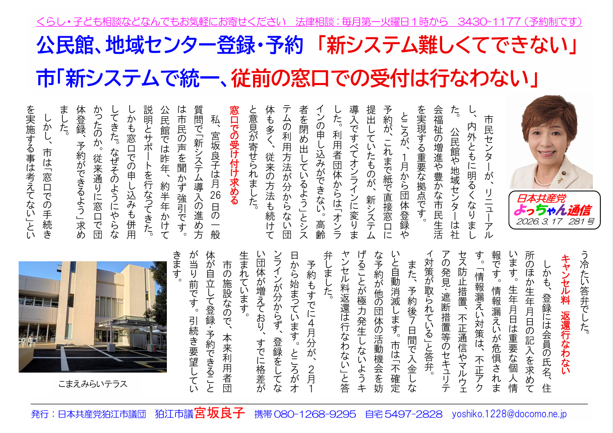 リニューアルした、こまえみらいテラス(旧中央公民館)や市民センター等の予約システムについてです。