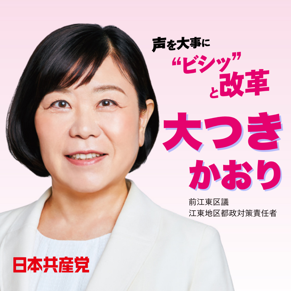 大つきかおりさんには学校給食無償化や子どもたちの東京オリンピック観戦中止させるなど大きな援助をいただきました。物価高騰やコロナ禍で子育て世代の経済的負担が増えたことをきっかけに学校給食無償化運動運動が起きました。 「義務教育は無償」の憲法の理念で給食費も無償にと、大つきかおりさんの質問や提案は大変力になりました。引き続き無償化や給食の質や量が担保される予算の確保を求めていくために、大つきかおりさんには都議会でがんばっていただきたいと思います。