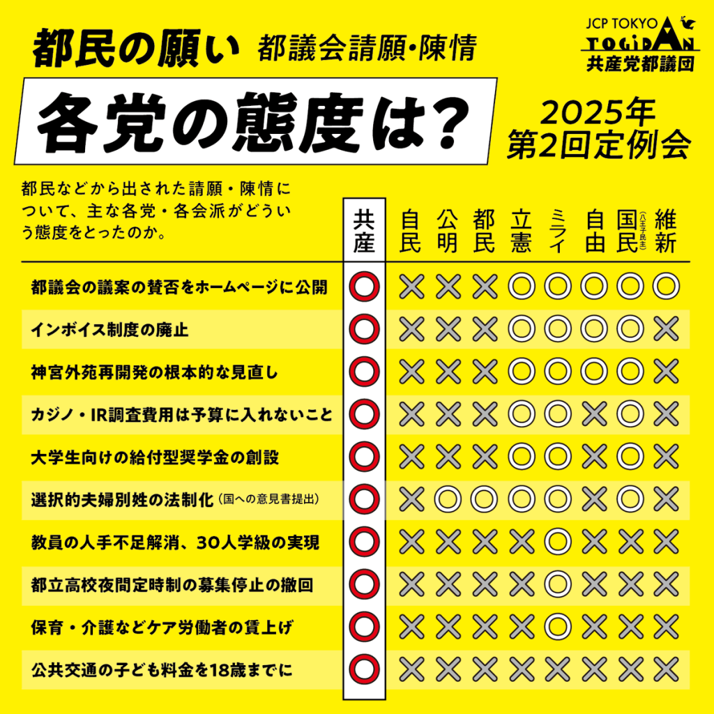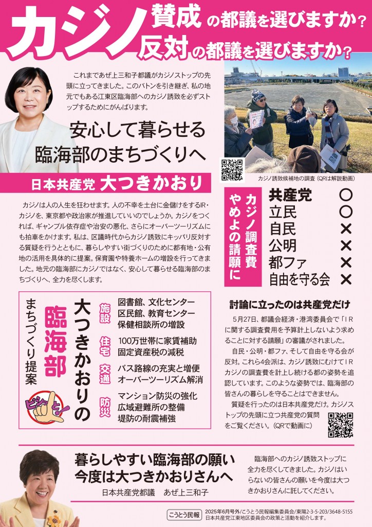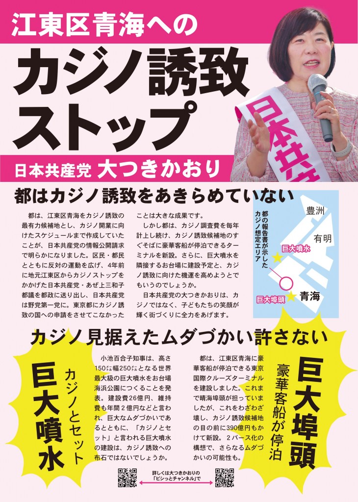 江東区青海がカジノ誘致候補地となっています。人生を狂わせるカジノ誘致には、絶対反対です。世界中で「カジノとセット」といわれる巨大噴水(ODAIBAファウンテン)の整備は中止させます。東京都民から提出された「カジノ・IR調査費用は予算に入れないこと」を求める請願に賛成した日本共産党の議員を、再び江東区から送り出してください。