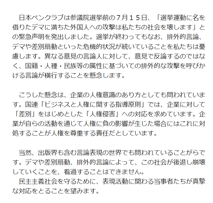 RT @w_writers_PEN: 一般社団法人日本ペンクラブ、女性作家委員会、言論表現委員会は、本日(8/5)15時、緊急声明を発出しました。