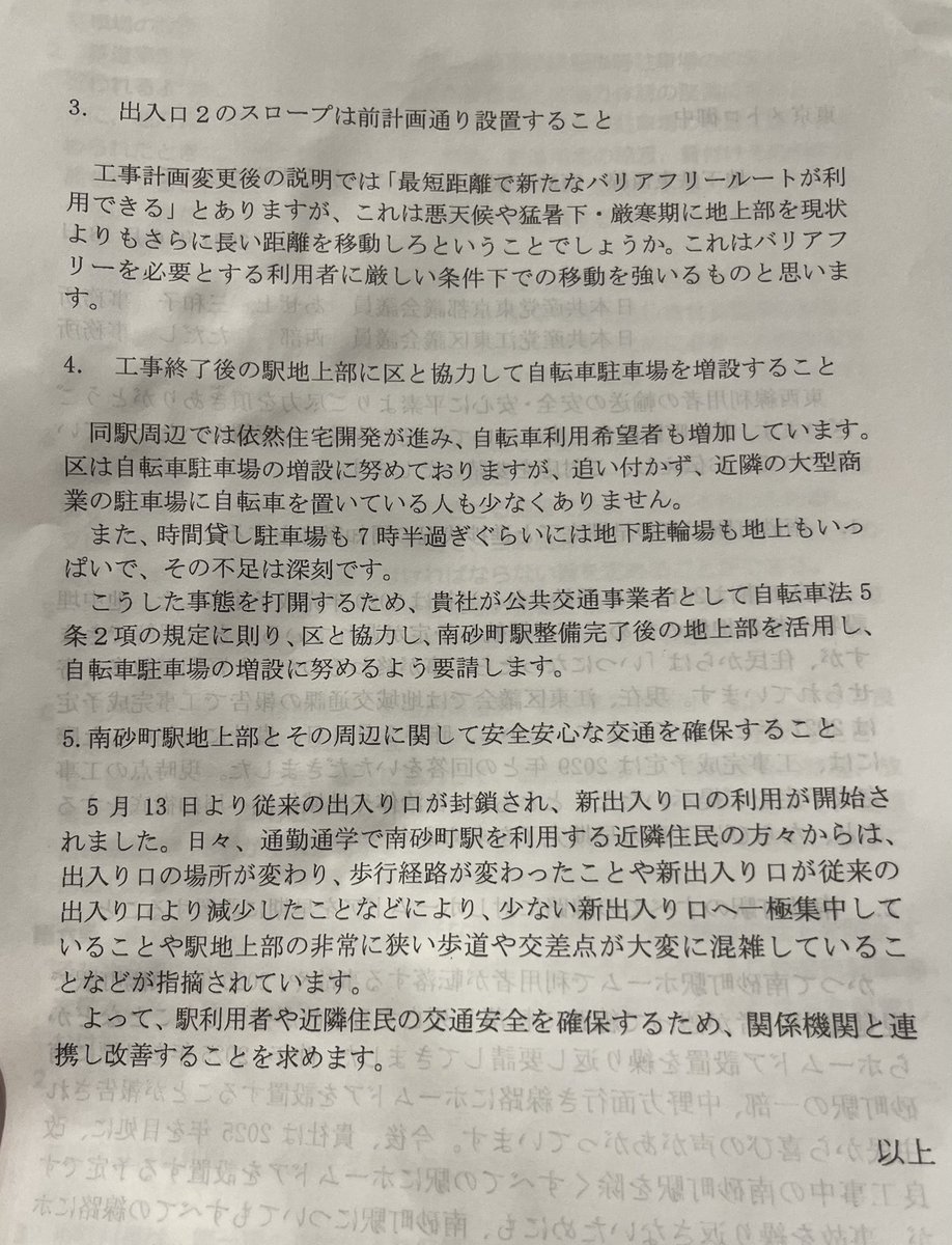 「工事スケジュールをきちんと周知して」「ホームドアの早期設置を」「階段の誘導音の設置を」「歩道が狭くて危険」「信号が短い」などの要望をメトロに伝えました。