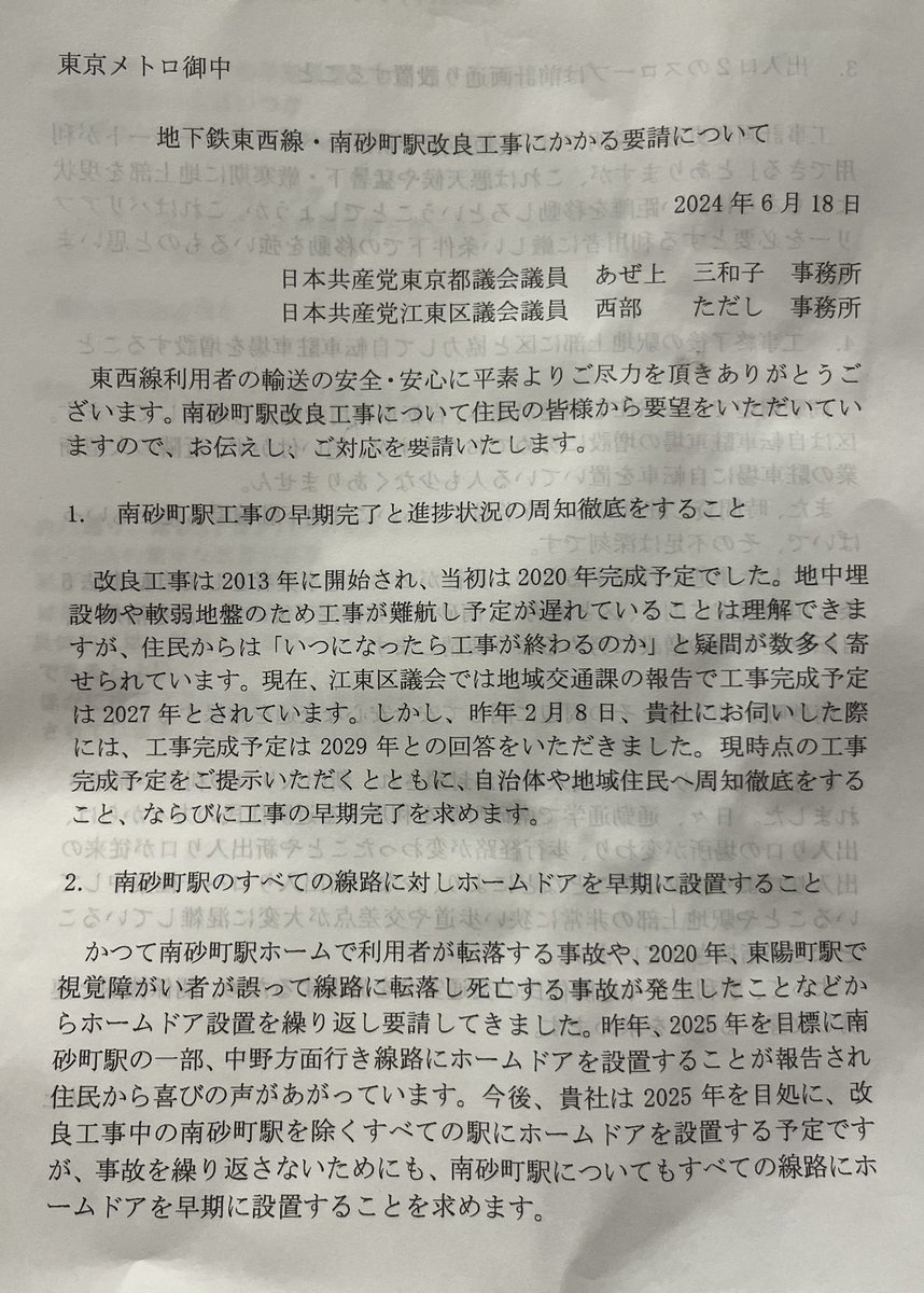 今日はあぜ上都議、西部区議、地域の方や視覚障害者の皆さんと、東京メトロに「東西線南砂町駅改良工事に関する要請」を行いました。