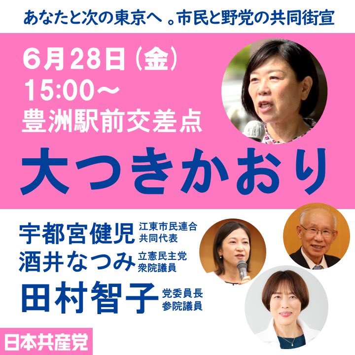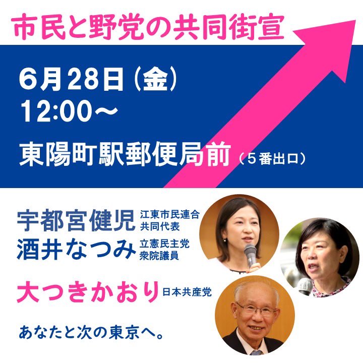 明日(28日)は、私、大つきかおり、そして宇都宮健児弁護士、酒井なつみ衆議院議員など、市民と野党で2か所で訴えます。