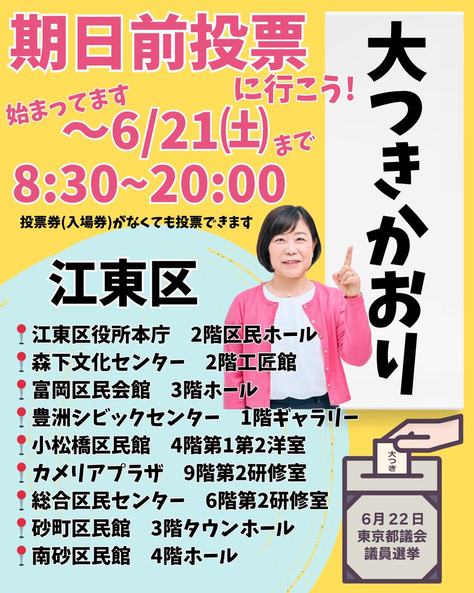 期日前投票が今日からスタートしました。江東区では6月21日㈯までバナーにある9か所で期日前投票ができます。時間は8:30~20:00までです。ぜひ「大つきかおり」と書いて投票してください!